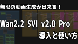 【動画生成AI】Wan2.2で無限の長尺動画を作れるSVI v2.0 Proの導入方法とワークフローの配布【Wan2.2】 Wan2.2、モデルやLoRAも増えてきて様々なジャンルの動画が作りやすくなってきています。たくさんの動画を作っていると、こう思う時が来ると思います。「長い動画を作りたい」と。しかし、通常の生成では5秒前後の動画しか作れなかったり、前動画の... 2026.02.04 AI動画生成AI