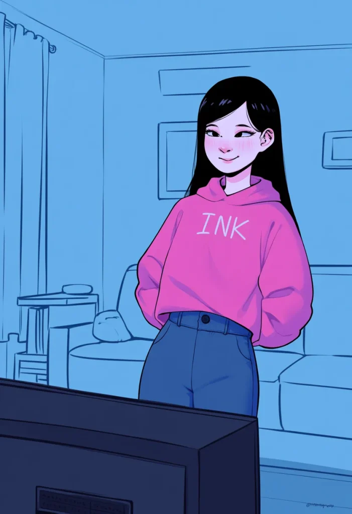 living room,television,window,1girl,black hair,long hair,ink hoodie,high-waist pants,smile