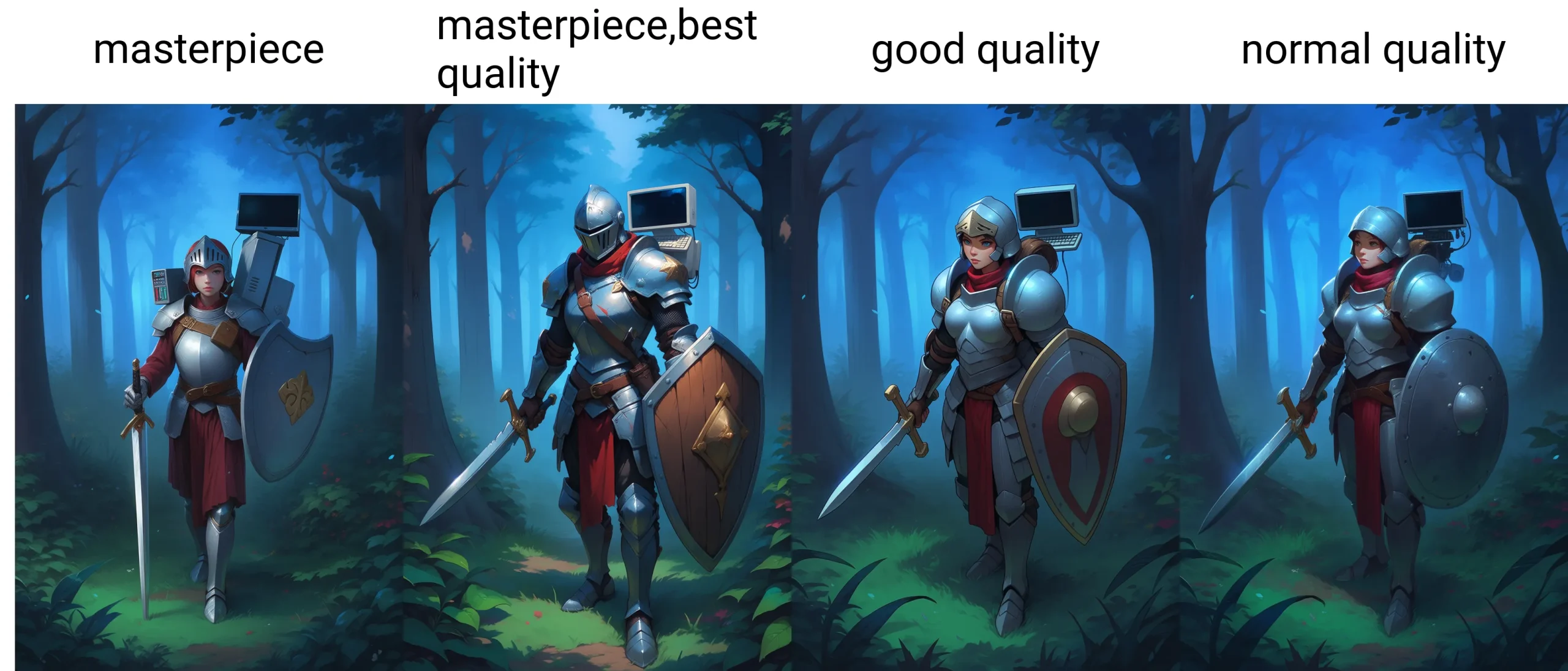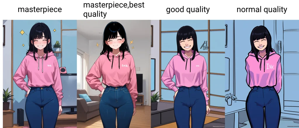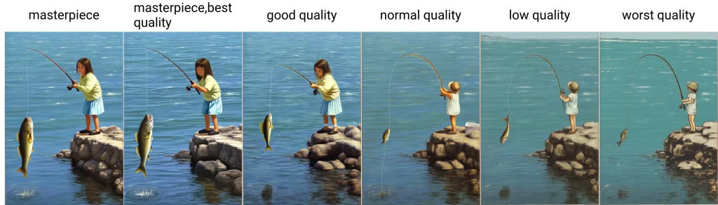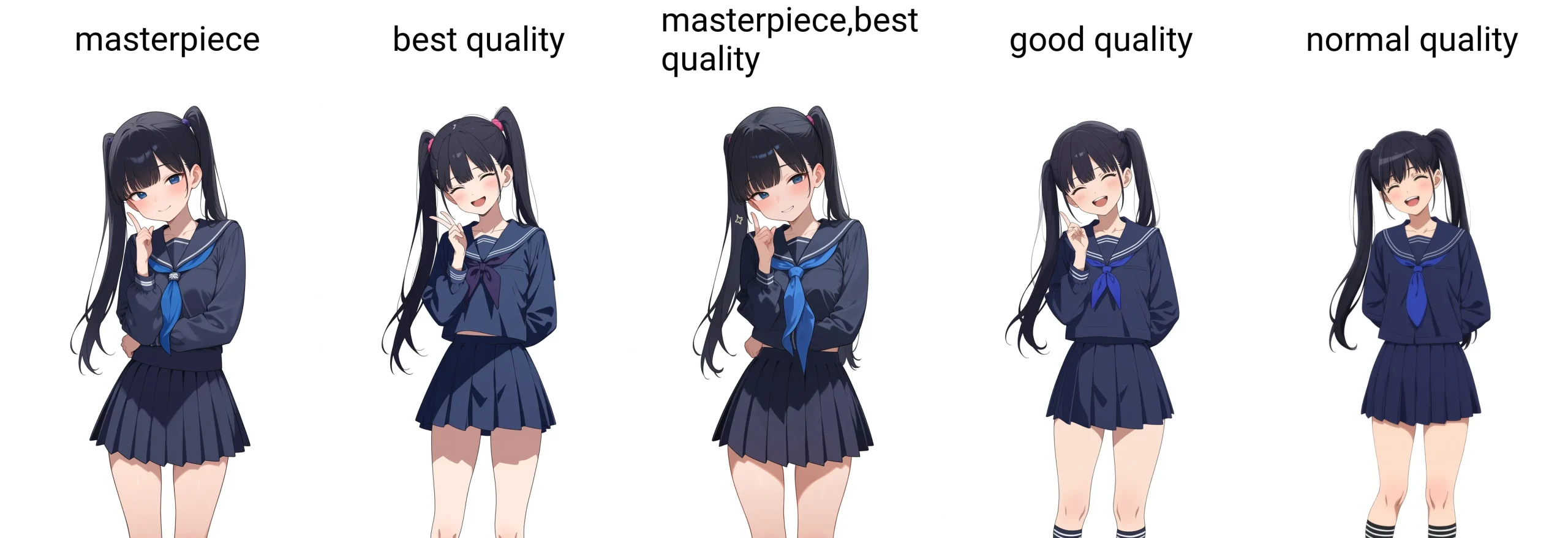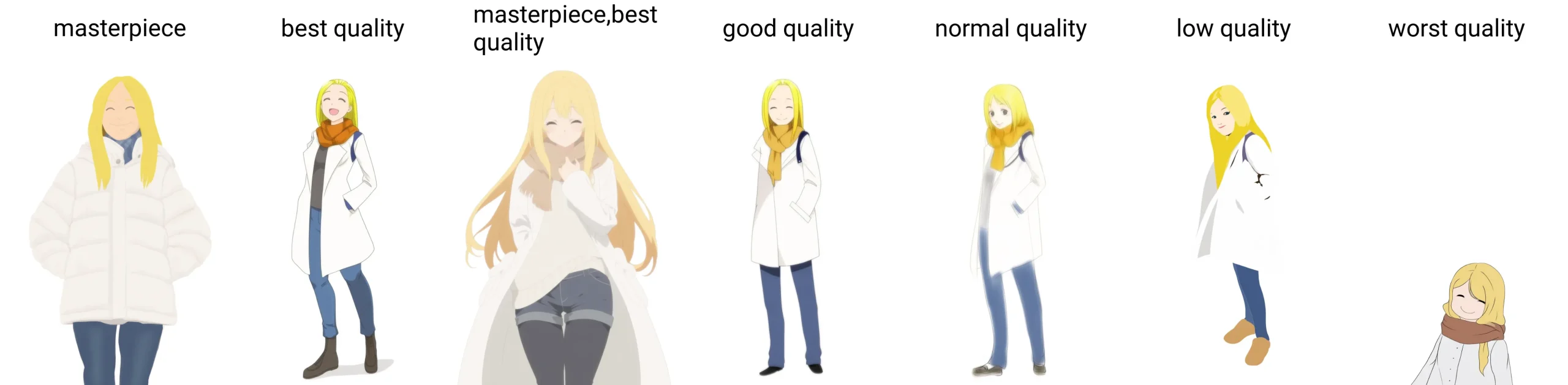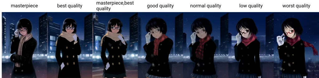 上記のプロンプトの頭にクオリティタグを追加して比較していきます。