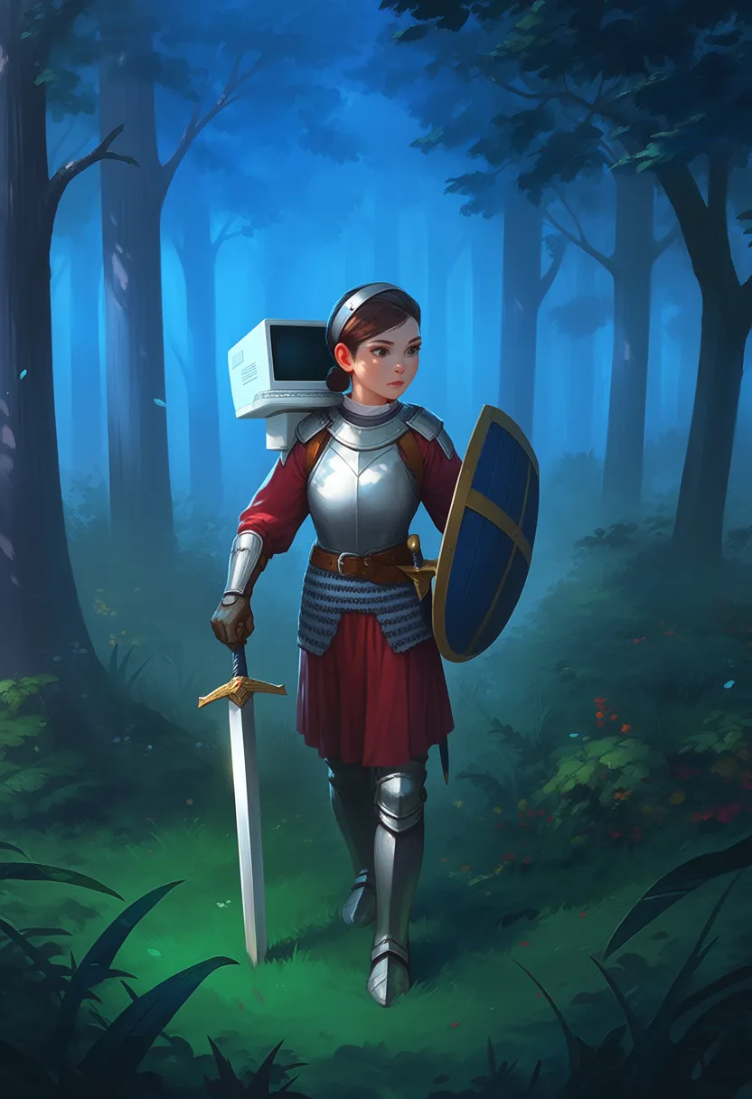 A girl in armor holding a sword and shield in the forest.He carries a computer on his shoulder.