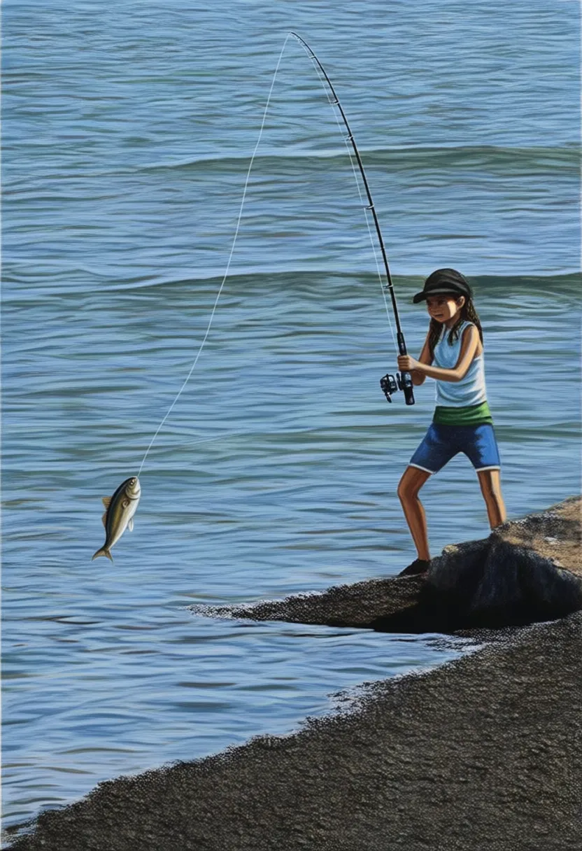A girl fishing in the sea.A girl is standing on a rocky shore and catching a big fish