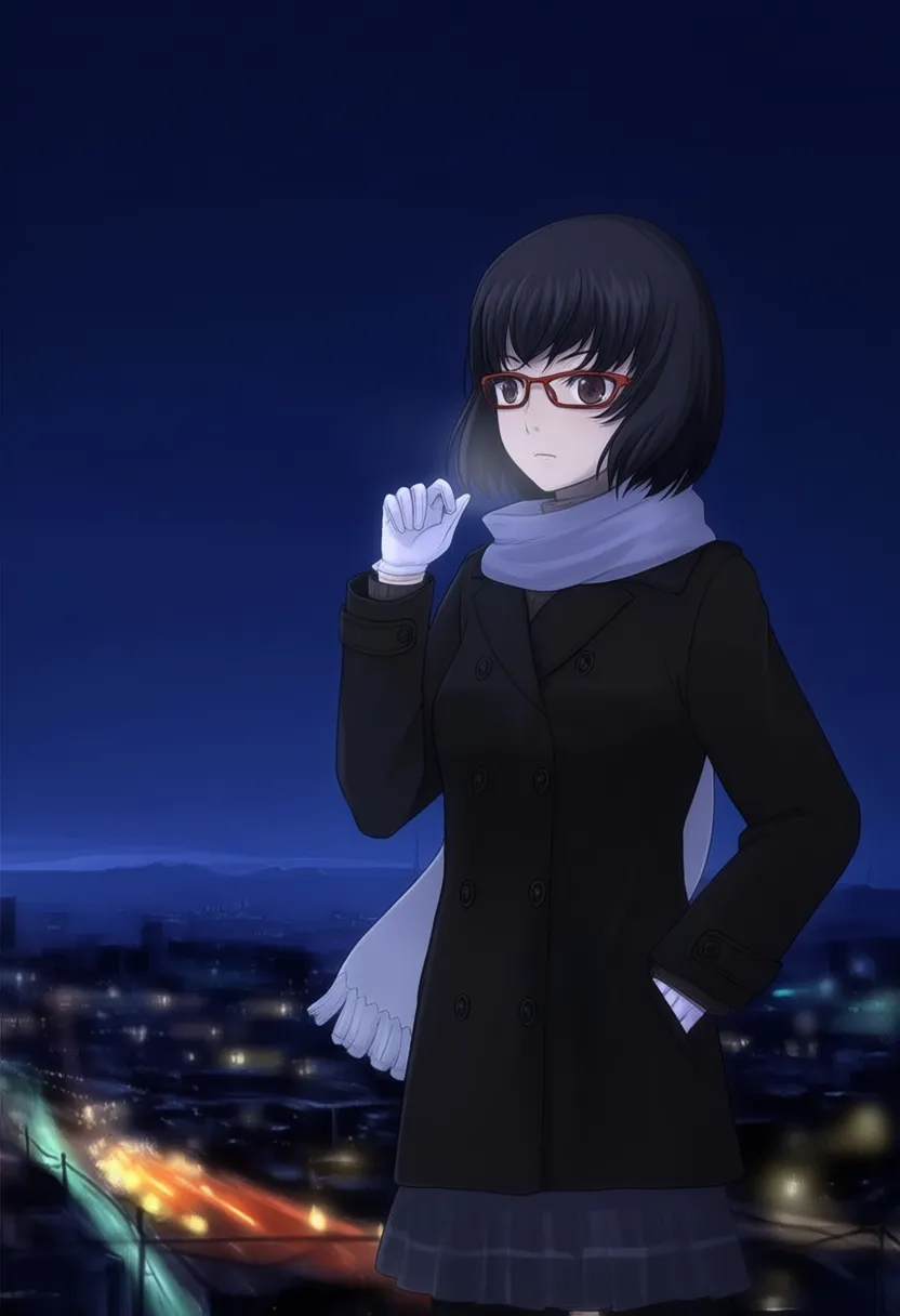 night,city,snowing,1girl,black hair,short hair,glasses,black coat,white gloves,scarf,skirt,