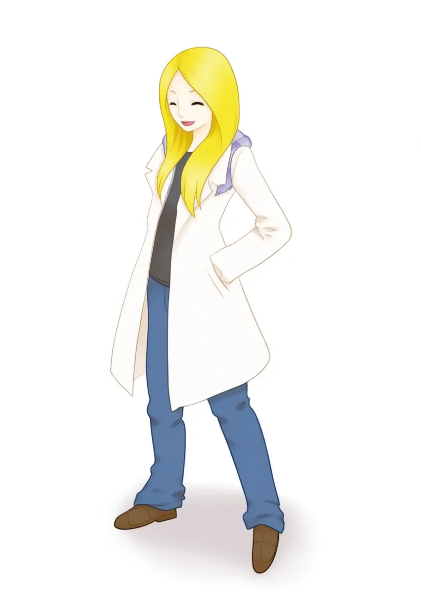 simple background,white background,1girl,blonde hair,long hair,white coat,scarf,denim,smile