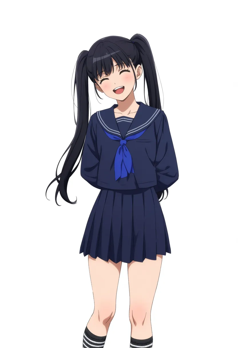 simple background,white background,1girl,black hair,twintails,school uniform,pleated skirt,smile