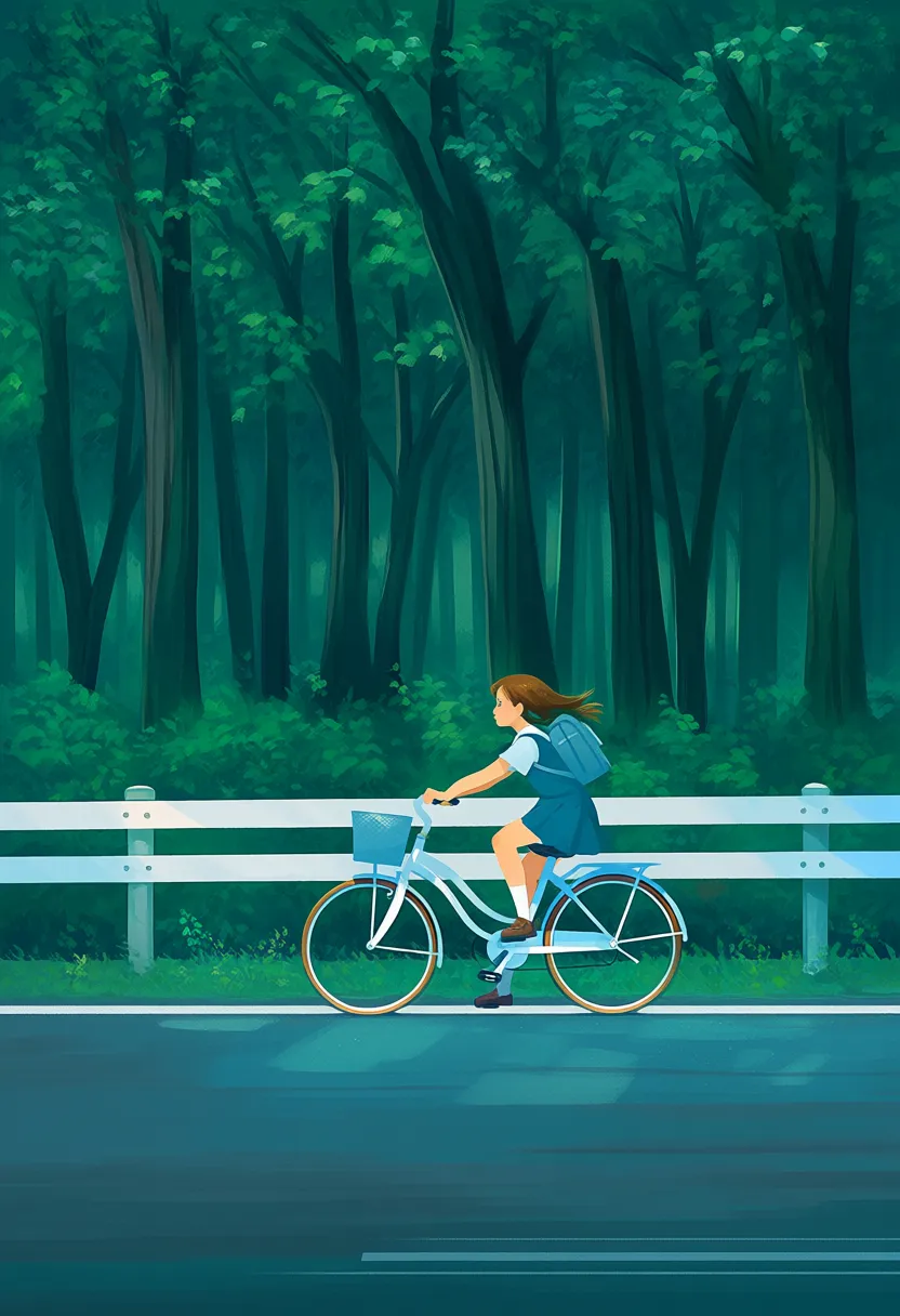 A girl riding a bicycle.She is riding her bicycle through the forest.