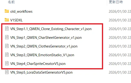 また、「old_workflows」と「V1SDXL」フォルダがありますが、両方とも古いワークフローなので使用しません