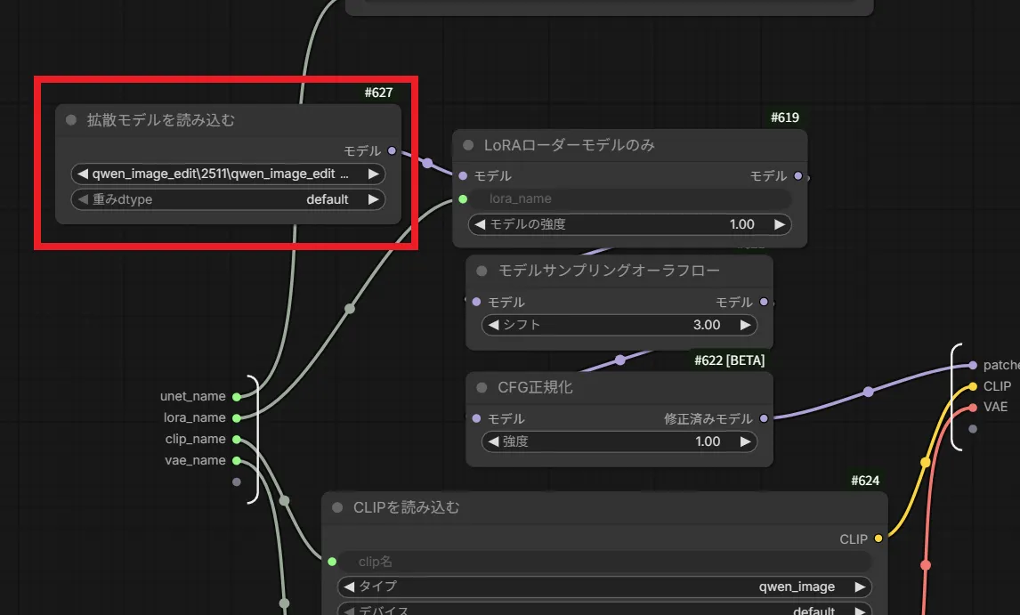 余談ですが、このワークフローで使用されている「Qwen-Image-Edit-2511」のモデルはGGUFのものが使われていますが、サブグラフの「QWEN_Loader」の中に入り、ノードを以下のようにするとFP8モデルなども使用できます。