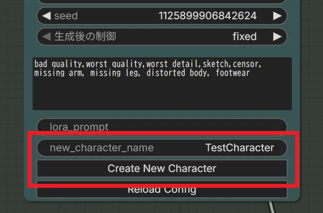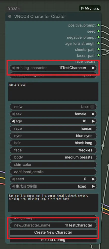 次に「VNCCS Character Creator」ノードの“new_character_name”にキャラ名を入力“Create New Character”ボタンを押します