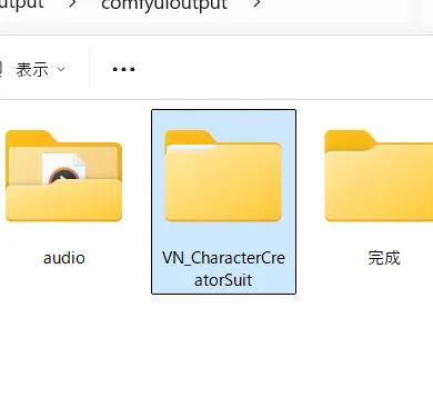 生成された画像は以下のComfyUIのアウトプットフォルダに「VN_CharacterCreatorSuite」フォルダとその中にキャラ名でフォルダが作成され、そこへ保存されます。