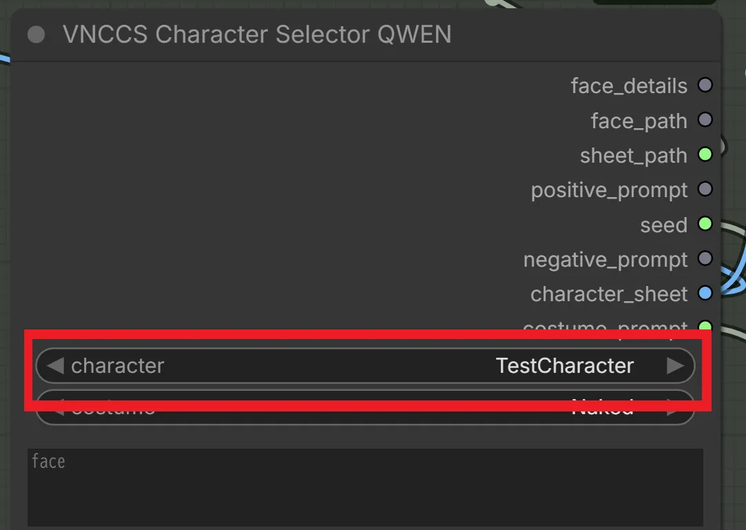 VNCCS Character Creator」というノードがあるので、このノードの“new_character_name”という部分にキャラクター名を入力していきます。