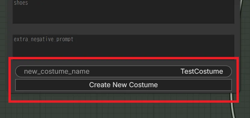 次に同ノードの下にある“new_costume_name”に衣装の名前を入力し、”Create New Costume”ボタンをクリックします。