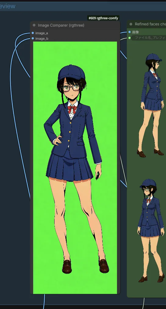 Image Comparer (rgthree)」ノードで衣装の適用前と適用後の比較が出来ます。もしサイズがズレている場合はシード値を変更して再生成してみてください。