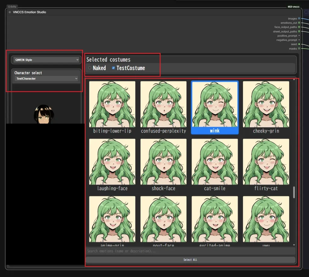 ワークフローを読み込んだら「VNCCS Emotion Studio」ノードの設定をしていきます。