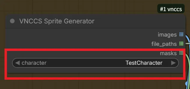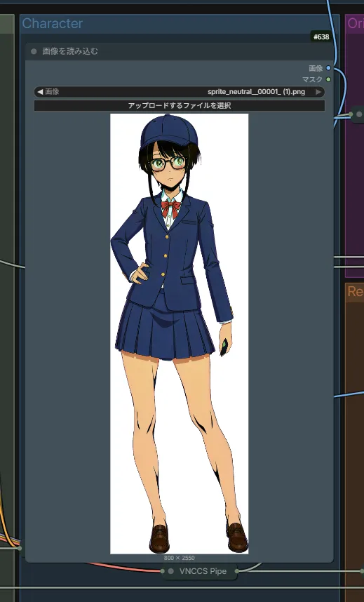 読み込んだら「VNCCS Sprite Generator」ノードの“character”にこれまで作成してきたキャラ名を指定しましょう。