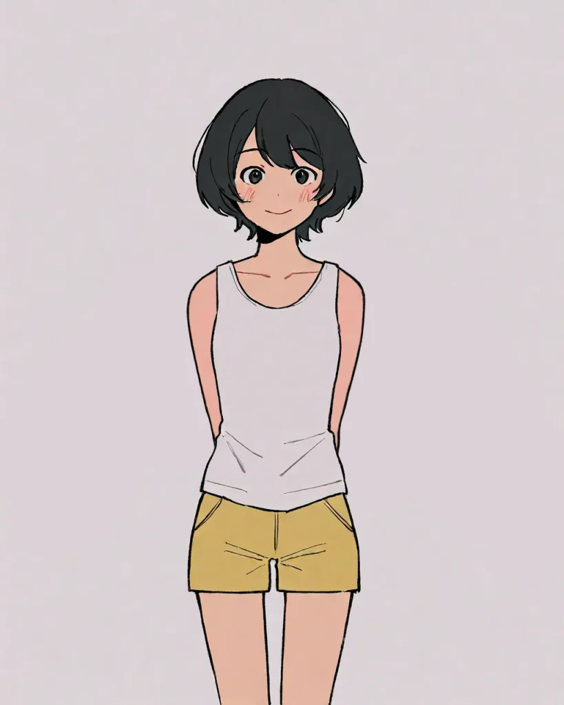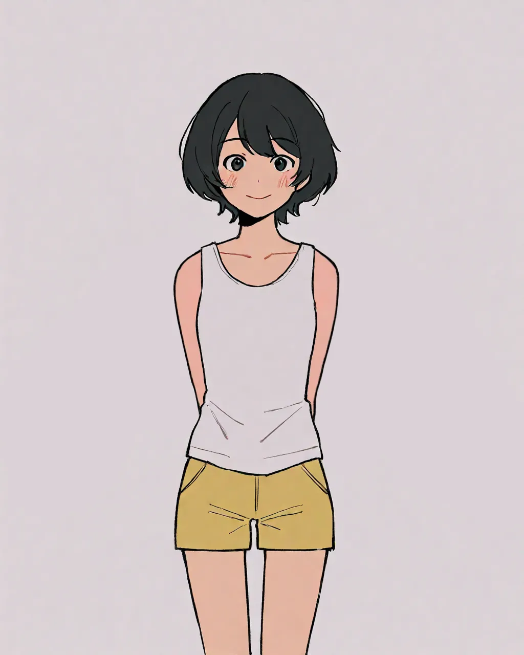 simple background,white background,straight-on ,1girl,black hair,short hair,tank top,shorts,smile,arms behind back