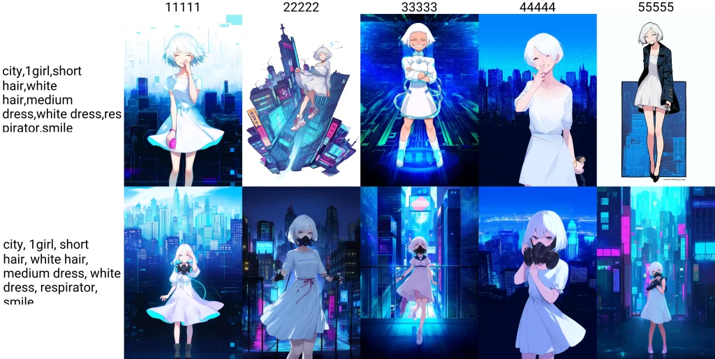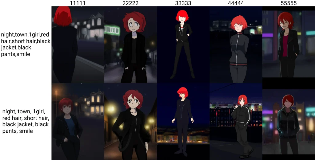 ポジティブプロンプトのタグごとの区切りとして使用しているカンマの後ろにスペース入れて比較します。上がスペースなし、下がスペースありの画像です。