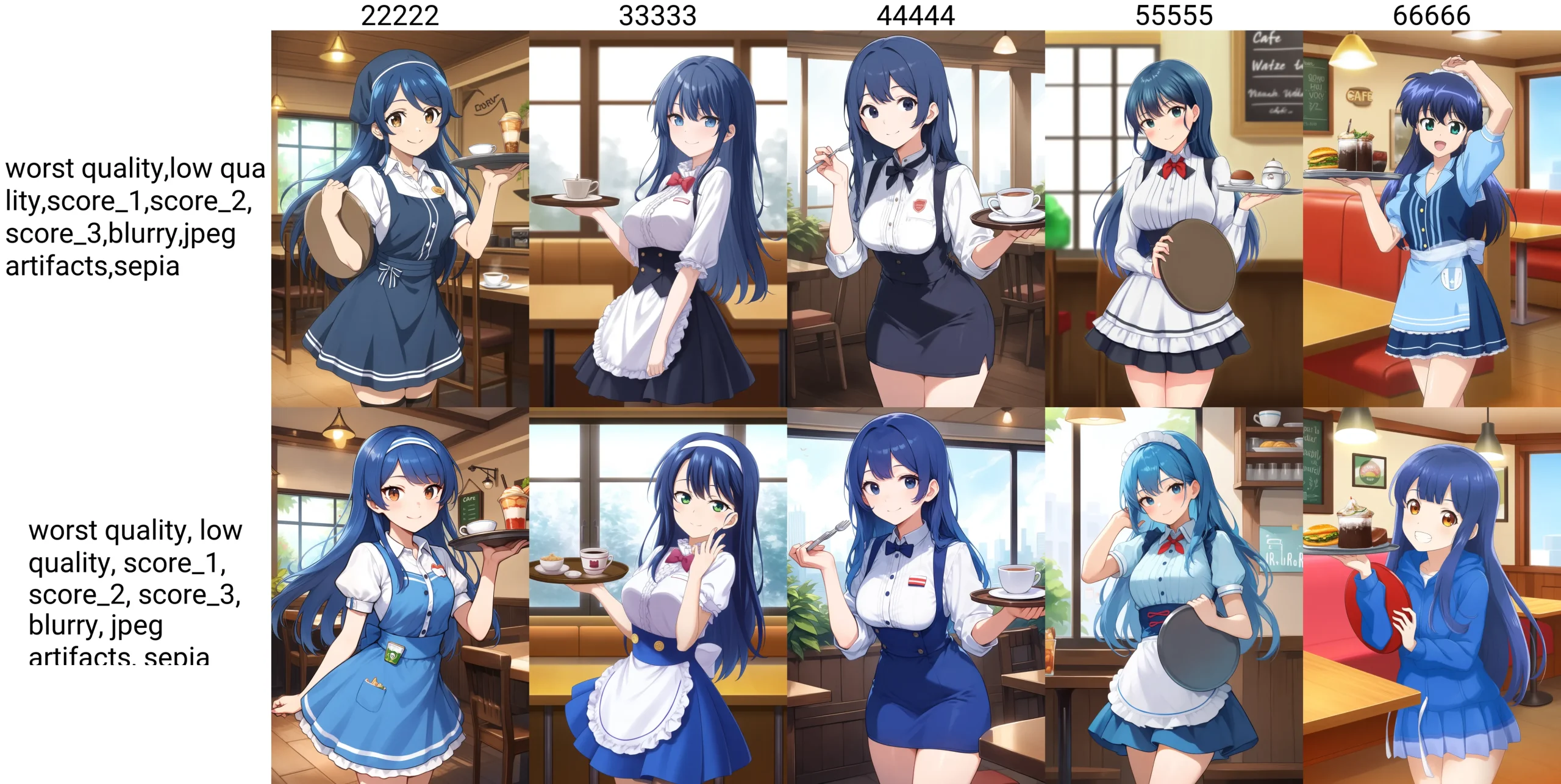 indoors, cafe, window, 1girl, waitressm, blue hair, long hair, holding tray, smile