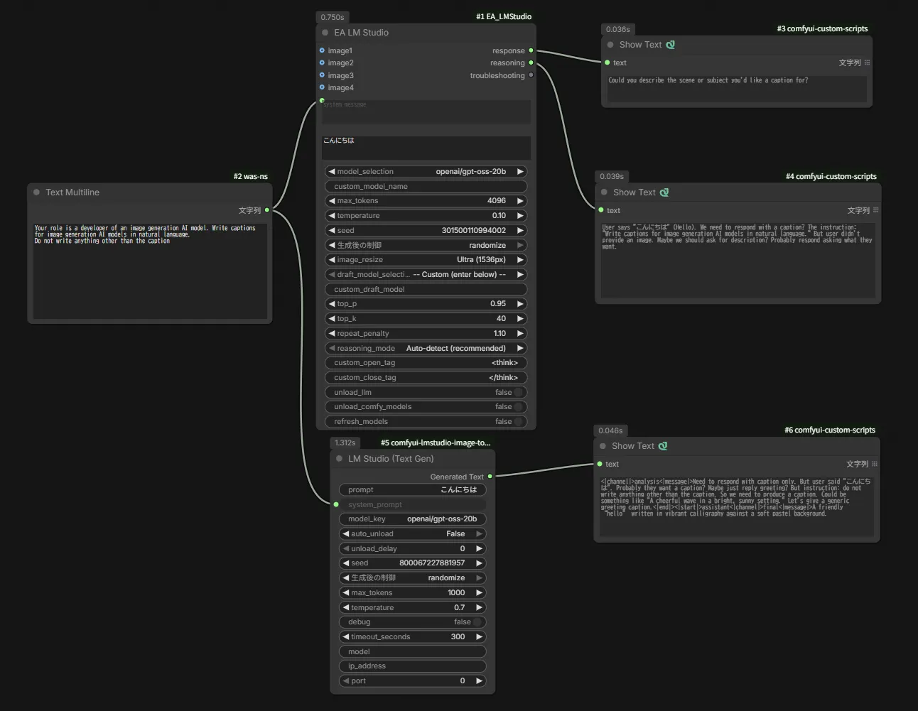 例として、EA_LMStudioのノードと、他のカスタムノードで追加されるノードで出力をしてみました。