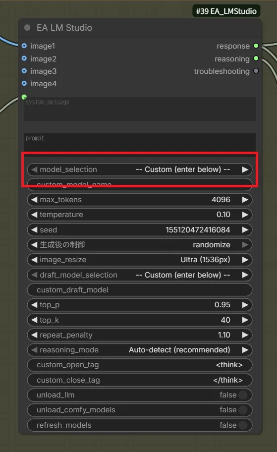 LM Studio系のカスタムノードは他を使用しても問題ありませんが、思考ステップ(reasoning)と応答ステップ(response)を分けて出力出来るカスタムノードを使用してください。